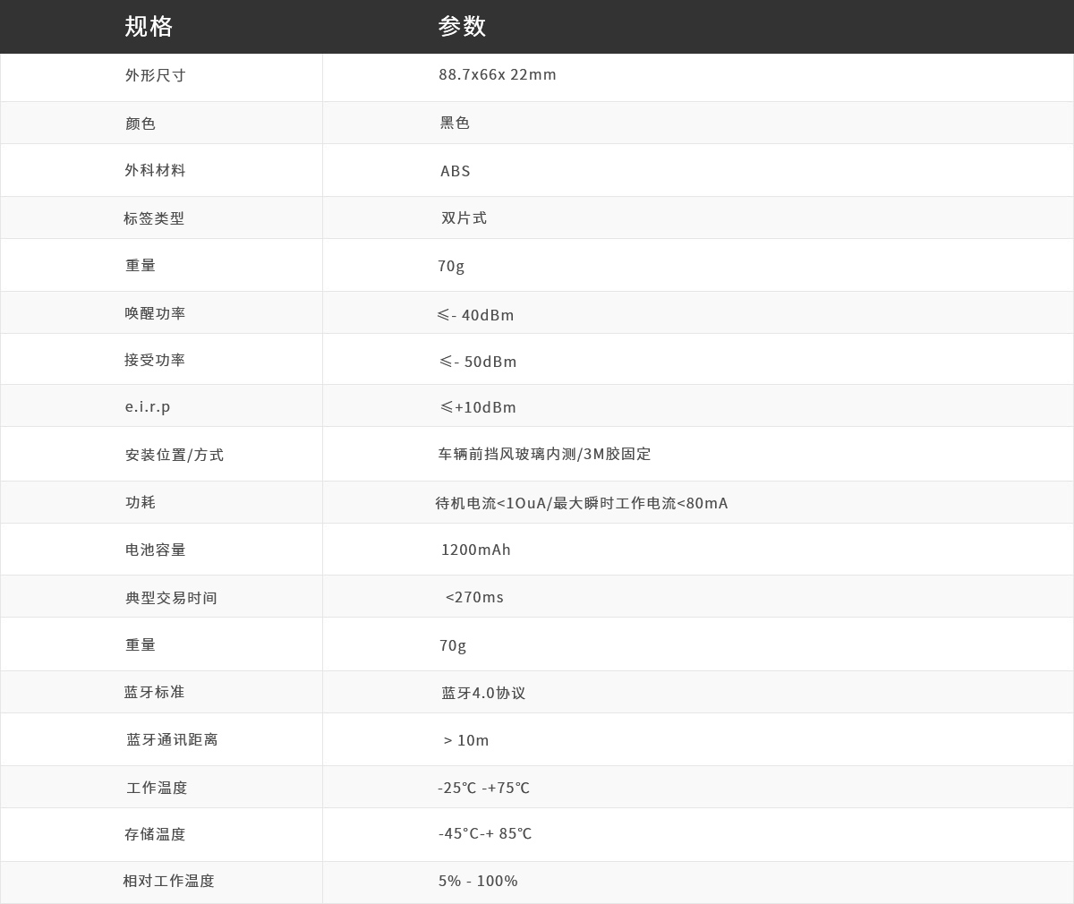 一款高可靠性、高性价比性、高集成度的双片式太阳能电子标签,适用于不停车高速公路收费站场景,作为车载设备存储车辆信息,与路侧单元进行微博通讯,在车辆行进途中进行车辆身份识别、路径标识、电子扣费,实现不停车收费。